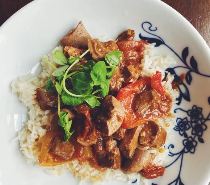 Pig kidney, onion, pepper, carrot. Comes with one rice. (Spicy)