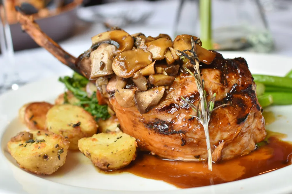 Grilled veal chop, roosted fingerling potatoes, and summer vegetables.