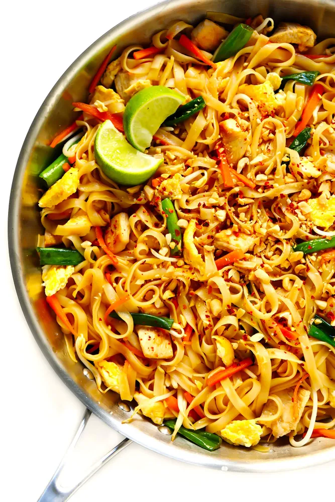 Sauteed rice noodles with egg, dried tofu, onions, peanuts, scallion and bean sprouts.