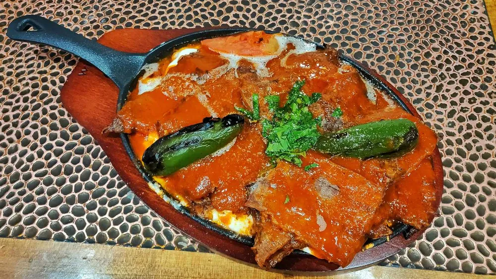 Döner prepared from thinly cut grilled lamb topped with hot tomato sauce over pieces of pita bread and generously slathered with melted sheep butter and yogurt.