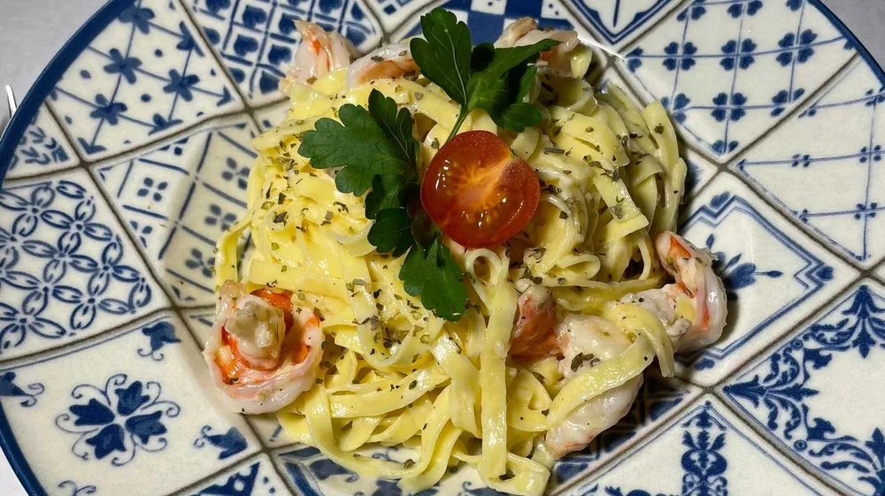 This shrimp alfredo pasta is made with fettuccine in a creamy parmesan sauce, Mushroom topped with sautéed garlic shrimp