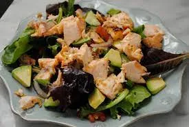 Salmon, lemon, zucchini, cucumbers, apples, tomatoes, spinach, onions, avocado, pecans, dressed with raspberry vinaigrette.