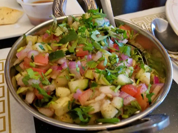 Chopped vegetable salad with garden fresh tomato, cucumber, carrots, and house dressing. Vegan and gluten-free