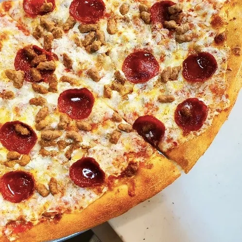 A mouthwatering sausage pizza. Pieces of perfectly golden sausage sprinkled on top of a cheese-loaded pizza.