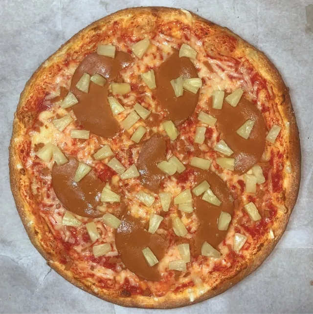 The classic Hawaiian pie, only vegan. Vegan ham coupled with pineapple and vegan cheese on top of homemade tomato sauce makes this pie to die for.