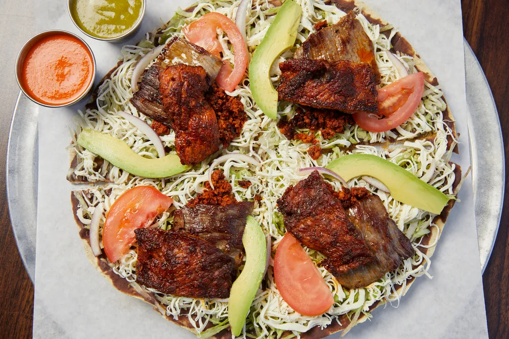 Mushrooms, jackfruit, Cauliflower, Corn, salsa Rancheras & Verde, Turmeric Cheddar Queso Cashew
