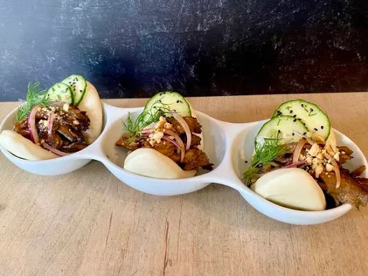 "Pickled cucumbers, dill, sesame, red onions, miso soy glaze, crushed peanuts "