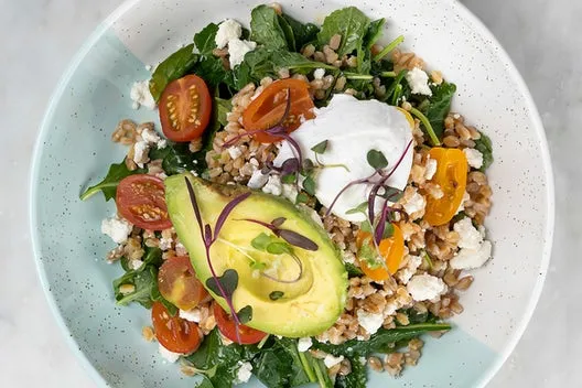 Sautéed kale, cherry tomatoes, feta, avocado, warm farro grain topped with a poached egg. Make it vegan by removing feta & poached egg. Allergens: D = Contains dairy, G = Contains gluten, E... Read More