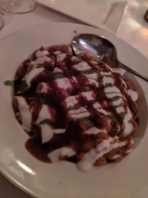 Flour crisp tossed with yogurt condiments tamarind and mint sauce.
