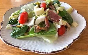 Perfectly marinated strip steak with roasted beets, sweet corn, green peppers, chick peas, black beans, red onions, cucumbers, Roma tomatoes and Romaine hearts.