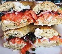 Nova Scotia lox, Cream cheese, lettuce, red onion, tomato, olives and garnish.
