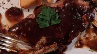 a roll of smoked meat, stuffed with cheese, breaded and fried, doused with a white creamy dressing