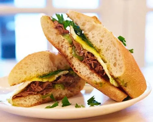 Grass-fed tenderloin, sunny up, caramelized onion aioli, fresh pickled jalapeño, farm greens, and French hero.