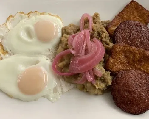 Traditional Mangu With Fried Dominican Cheese And Salami And Eggs Any Style