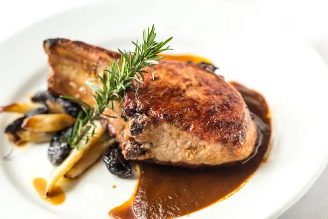 Grilled Double Cut Pork Chop. Cascabel Salsa. Garlic Adobo Rub. Roasted vegetables. Corn chips and salsa.