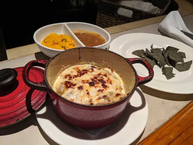Traditional brunch style chicken guisado casserole. Tomatillo, blue corn chips, and sour cream. Rice and baked beans. Corn chips and Salsa.