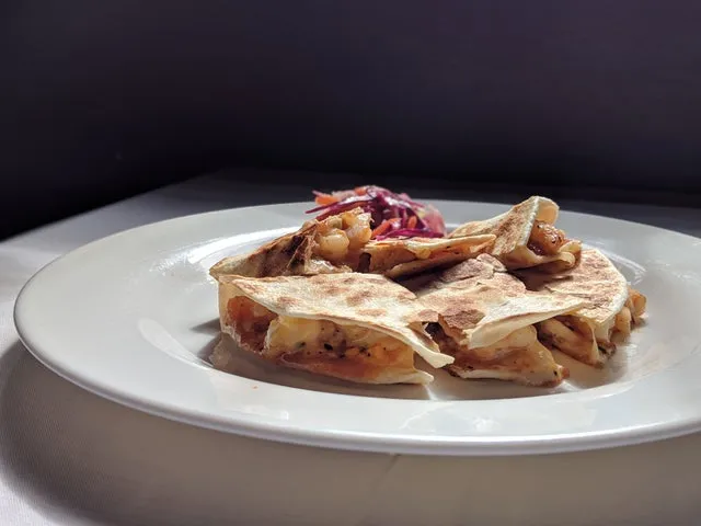 Sauteed white shrimp. Roasted tomato and jalapeno salsa. House blend of cheeses and flour tortillas.