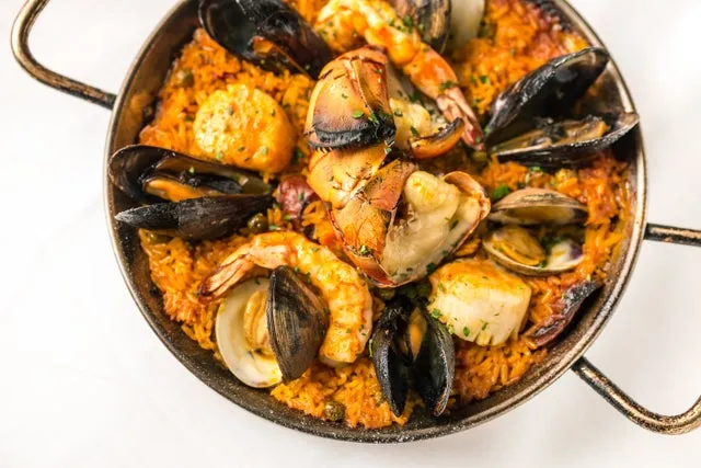 Clams, Mussels, Scallops, Shrimp, Chorizo, and market fish. Rice with peas and pimentos. Tomato Sofrito. Fish stock. Corn chips and salsa.