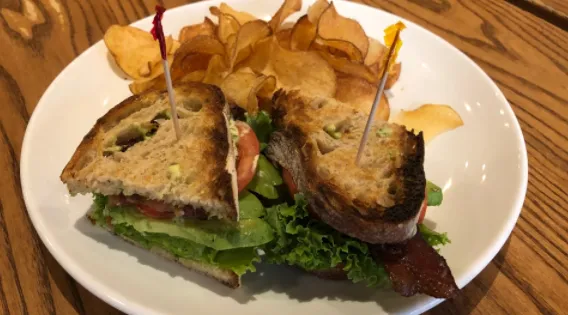 Bacon, lettuce, avocado, tomato, herb aioli on toasted sourdough with vinegar chips