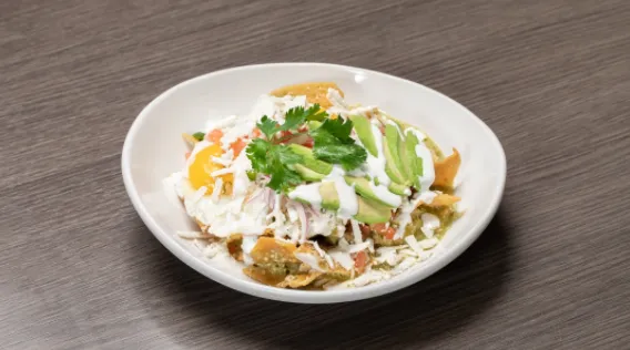 Sunny-side eggs, fried tortillas, tomatillo salsa, avocado, cotija cheese, red onion and crema.
