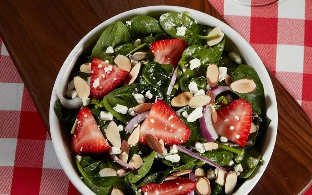Baby spinach, red onions, cherry tomatoes, bacon, crumbled gorgonzola cheese and balsamic vinaigrette dressing.