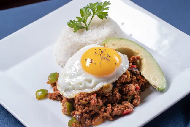 Ground beef, peppers, onions, olives, raisins, avocado, sunnyside egg served with white rice and black beans