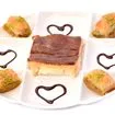 Sweet pastry made of extremely thin sheets of fillo dough layered with chopped nuts and honey syrup baked with butter and cut into diamond shapes.