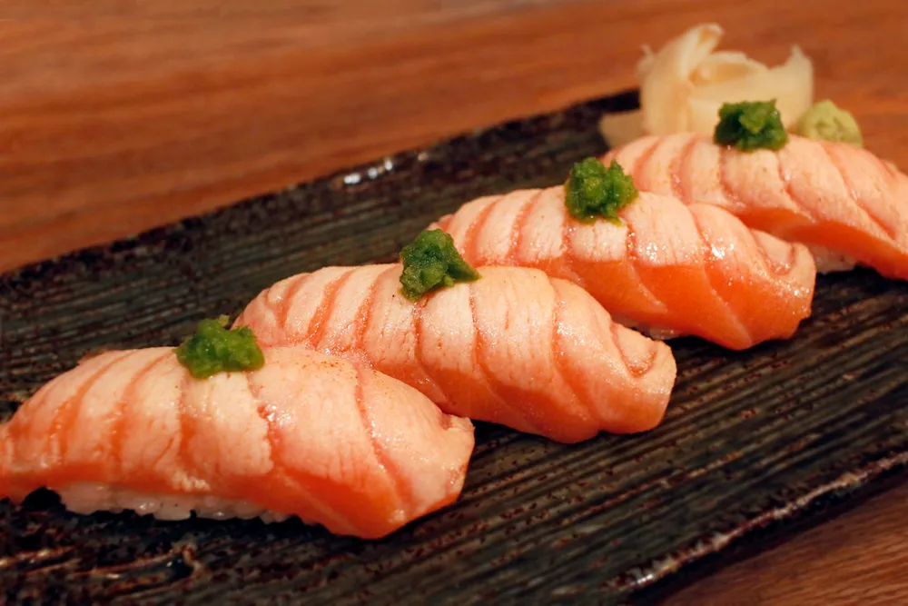 Seared Salmon Nigiri Sushi Topped with Olive & Jalapeno.