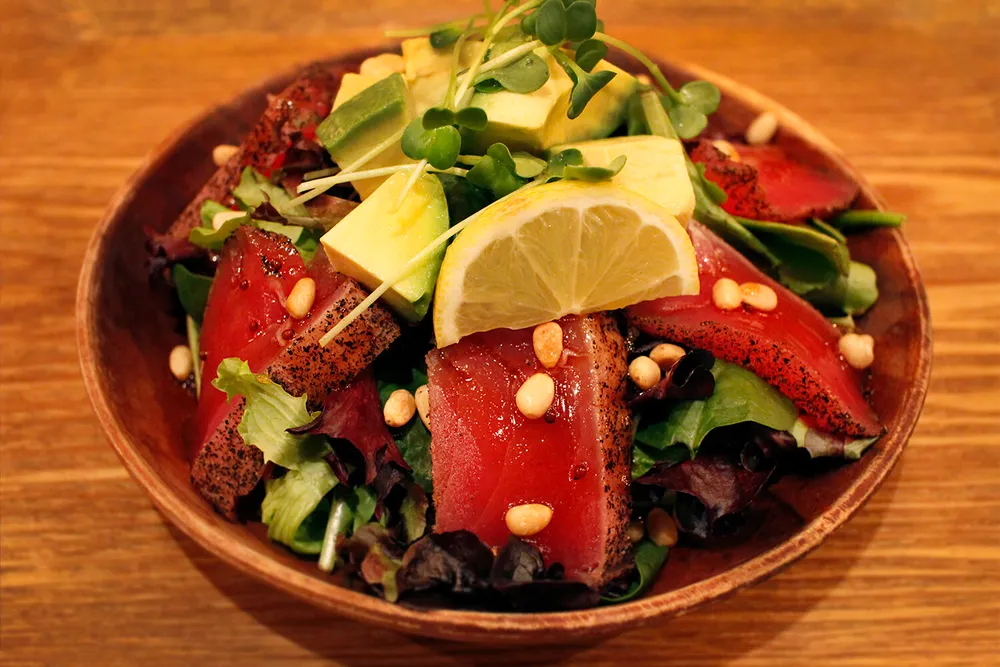 Seared Tuna, Pine Nuts, Avocado, Green Salad with Sesame Flavored Ponzu Mayo Dressing