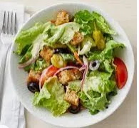 Lettuce, cucumbers, tomatoes, onions, raw bean sprouts, and light peanut dressing.