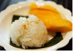 Fresh Mango slices, sweet coconut sticky rice topped with coconut milk cream