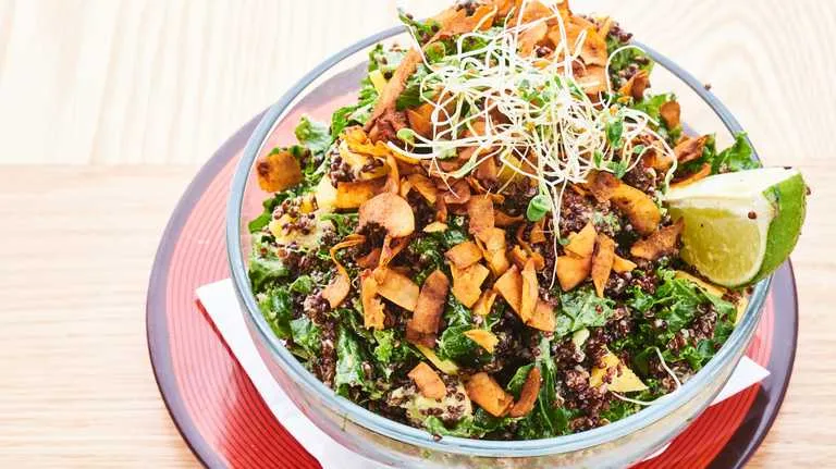Mango, avocado, red quinoa, smoked coconut shards, scallion with jalapeño chia-cilantro dressing. Gluten free.
