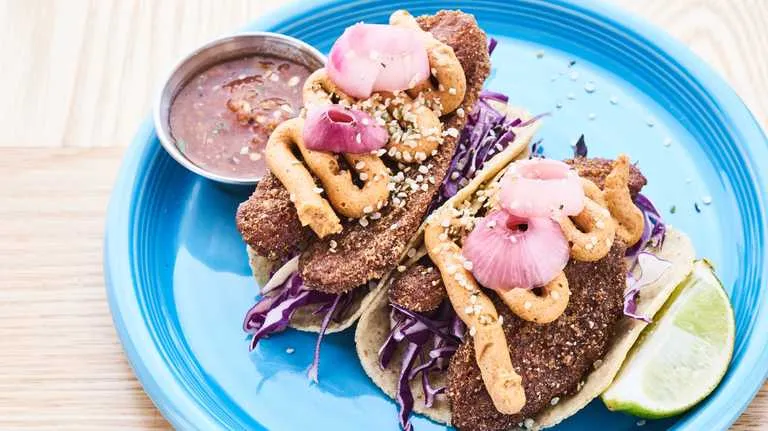 Hemp and flax seed battered chayote squash, chipotle almond butter, pickled red onion. Spicy. Contains nuts. Gluten free.
