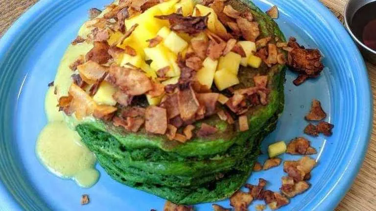 Triple stack, coconut mango jam, shaved coconut, maple syrup.