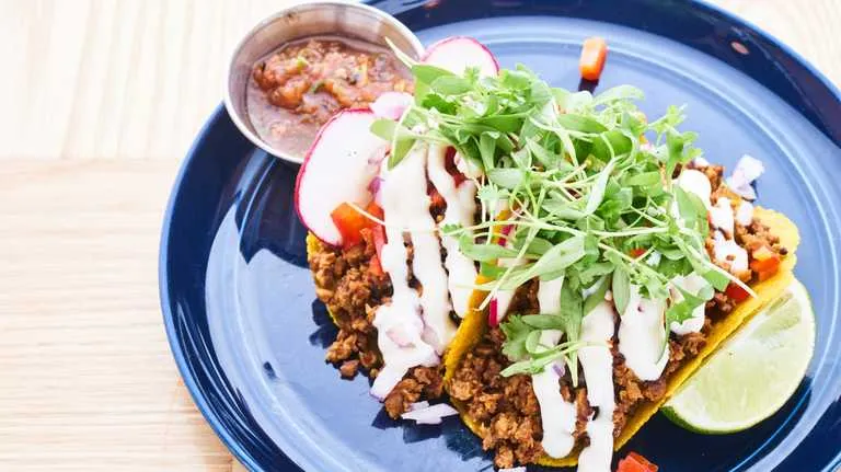 Turmeric tortilla, radish, micro cilantro, red pepper, and sour cream. Spicy.