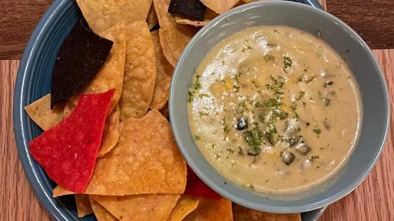 Melted coconut queso, shredded poblano peppers. Gluten Free