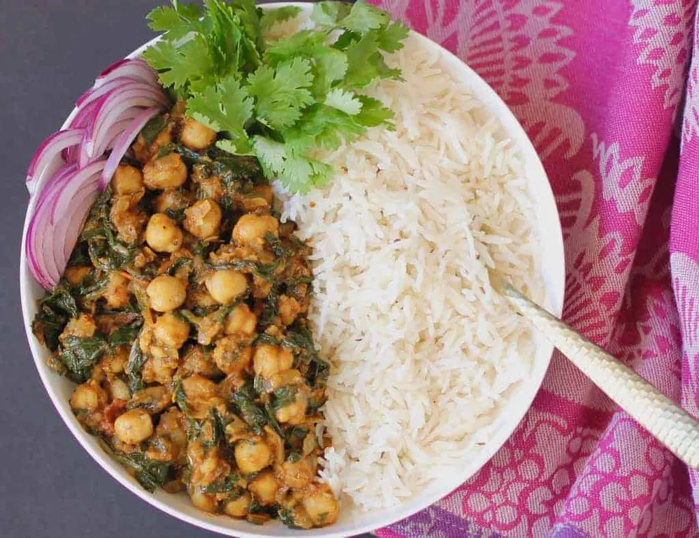 CHICKPEAS/GARBANZO BEANS COOKED WITH PUREE OF SPINACH, GINGER, GARLIC, ONION & SPICES VEG/VEGAN/GF Served with Premium Basmati Rice
