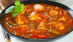 AN ANGLO-INDIAN SPECIALTY; CUBES OF CHICKEN COOKED IN A SOUR, SWEET & SPICY SAUCE WITH CAPSICUM & DICED ONIONS-GF Served with Premium Basmati Rice