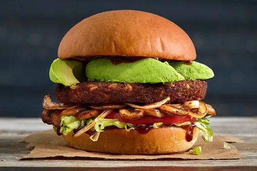 Vegan Patty, Fresh Avocado, Sautéed Mushrooms, Grilled Onions, Lettuce, Tomato, BBQ Sauce, Potato Bun