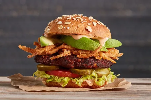 Vegan Patty, Fresh Avocado, Fried Onion Strings, Pickles, Lettuce, Tomato, MOOYAH Sauce, Multigrain Wheat Bun