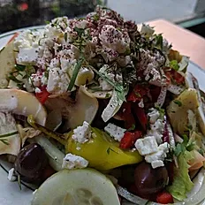 Artichoke hearts, romaine, onions, peppers, feta, lemon, olive oil.