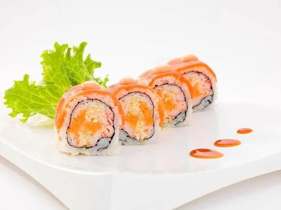 Spicy crunchy crabmeat, salmon ,avocado and tobiko covered with pink soy paper