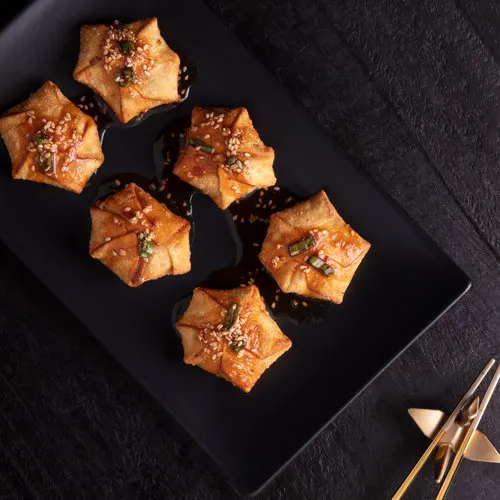 Crispy wontons with savory pork filling, sesame dipping sauce